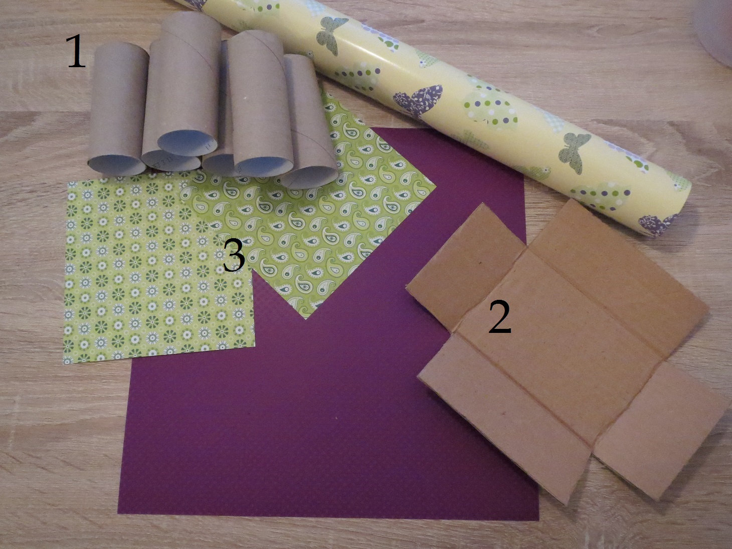 3. Dekopapier o.Ä. (grün und Geschenkpapier wird für die Klorollen verwendet, lila für die Box außenrum)