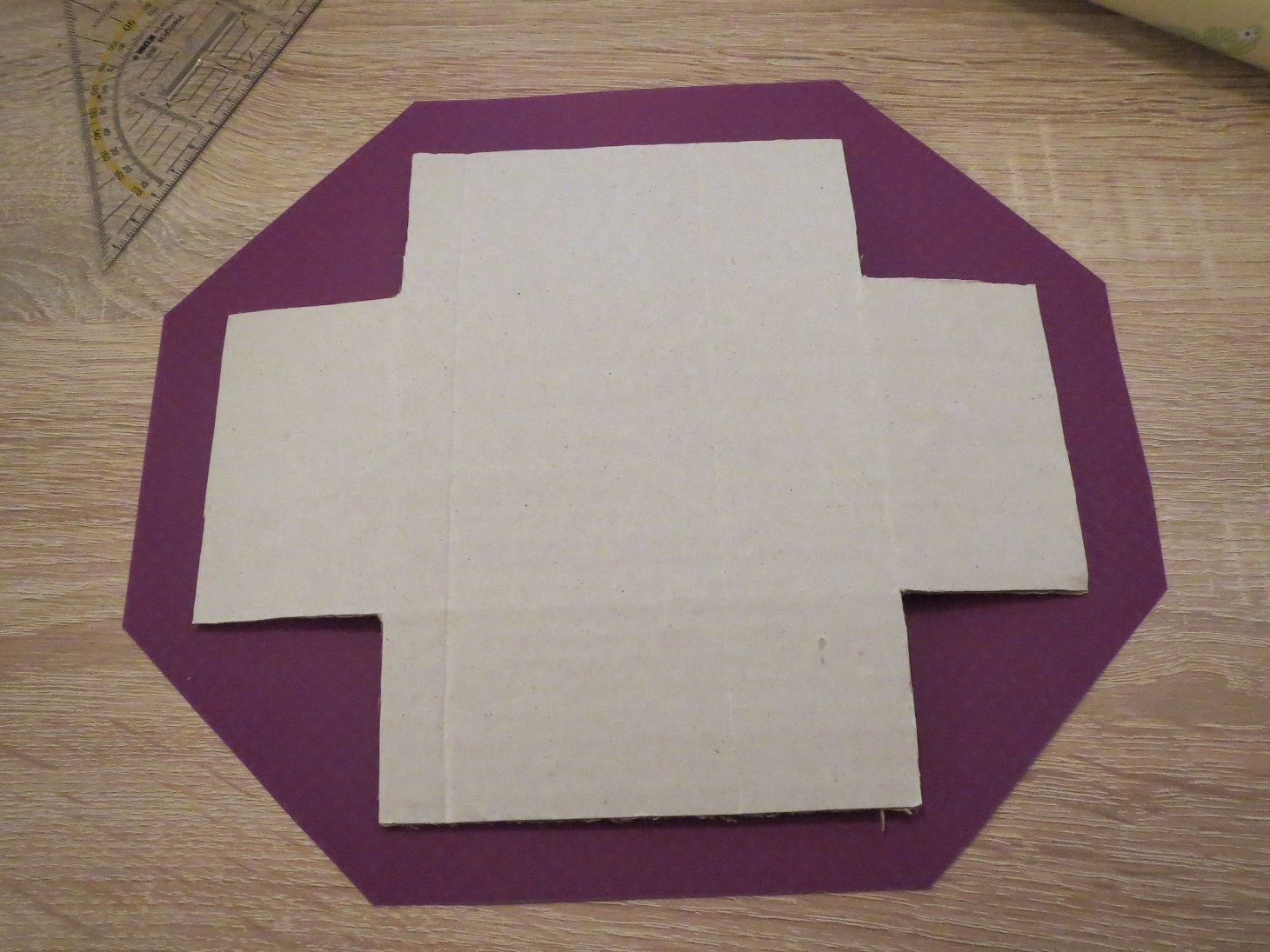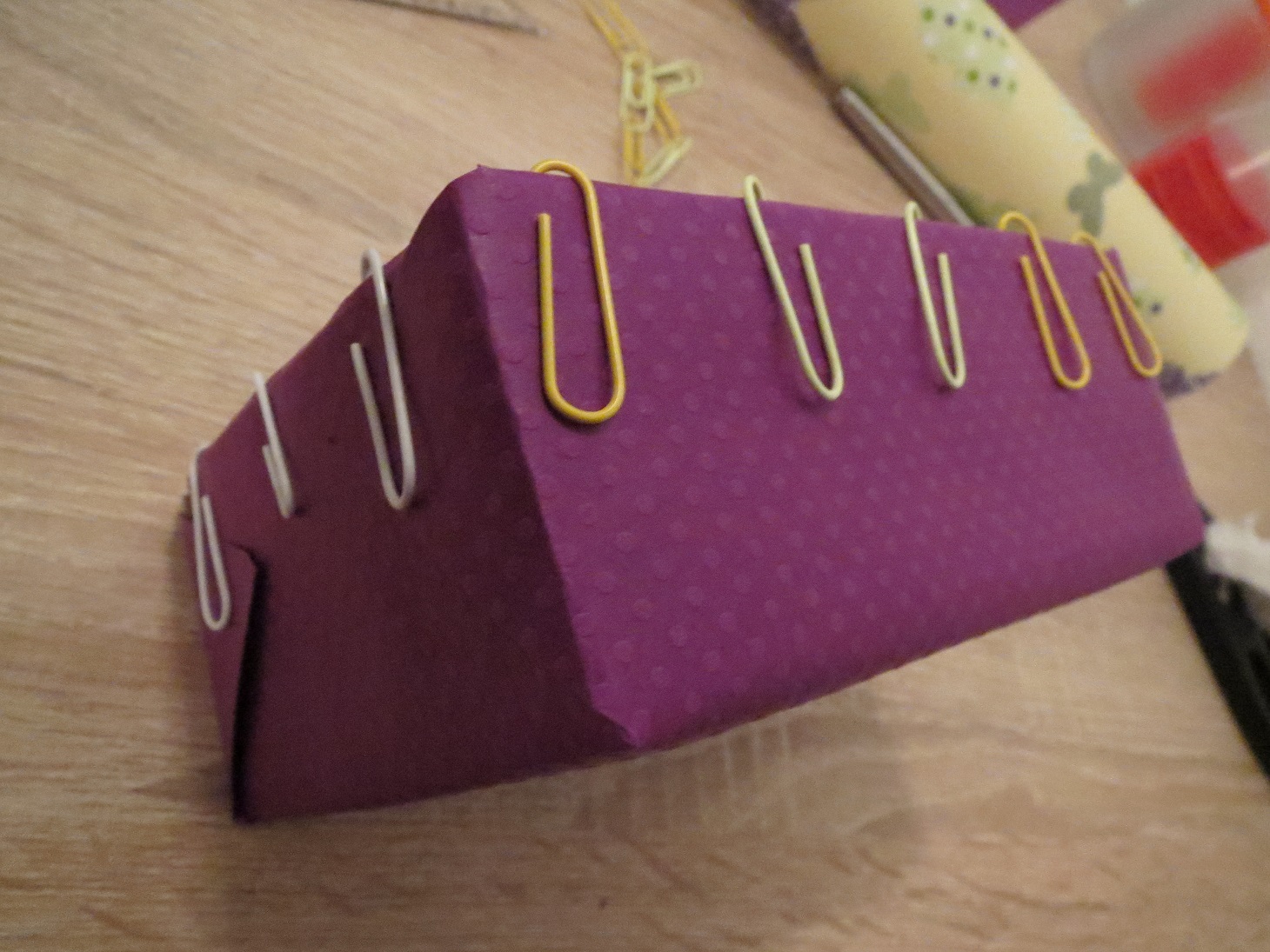 Zunächst habe ich die Pappe so zugeschnitten, dass ich sie als kleine Box verwenden kann, in die die Klorollen später gestellt werden. Dann habe ich das lila Dekopapier auf die Pappe zugeschnitten und Pappe und Dekopapier wurden miteinander verklebt. Damit der Kleber trocknen kann, hab ich das ganze zwischenzeitlich mit Büroklammern festgehalten.