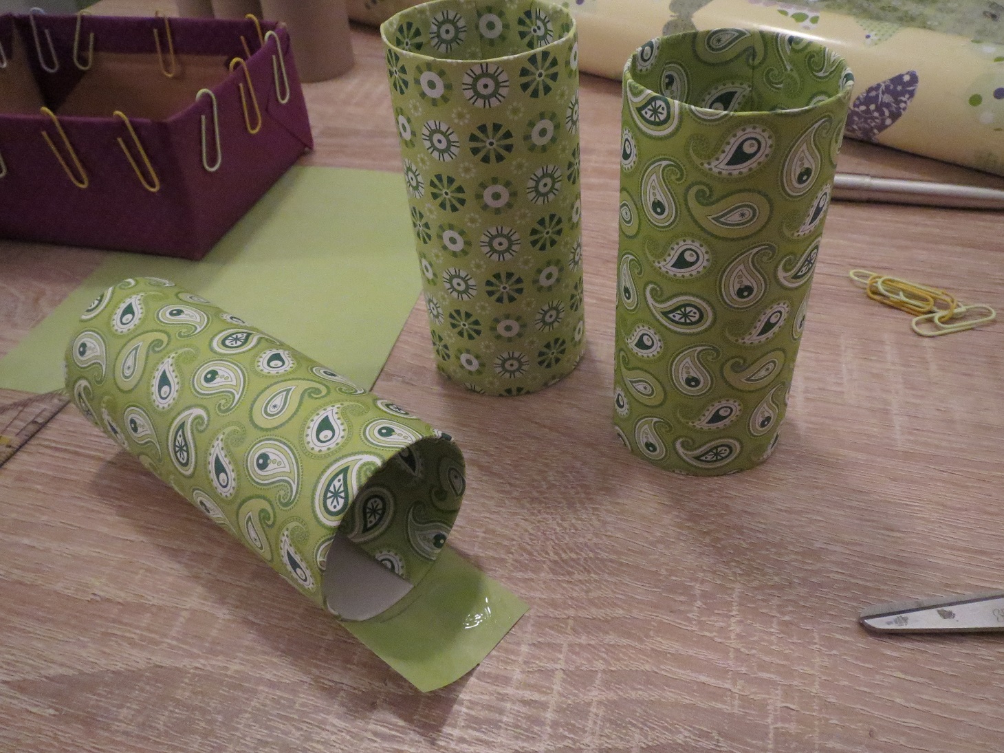 verwenden. Dafür habe habe ich die Papiere passend zugeschnitten und anschließend die Klorollen damit beklebt. Danach habe ich die Klorollen unten mit Büroklammern verbunden (ich wollte nicht