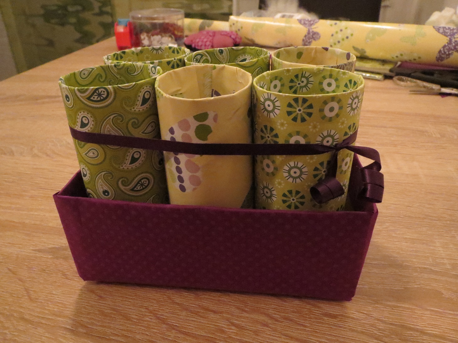 kleben, falls ich sie mal anders zusammenstellen möchte) und oben ein Stück Geschenkband drumgebunden. Die sechs Klorollen landeten dann schließlich in der lila Box (auch ohne Kleben), Stifte rein und fertig!