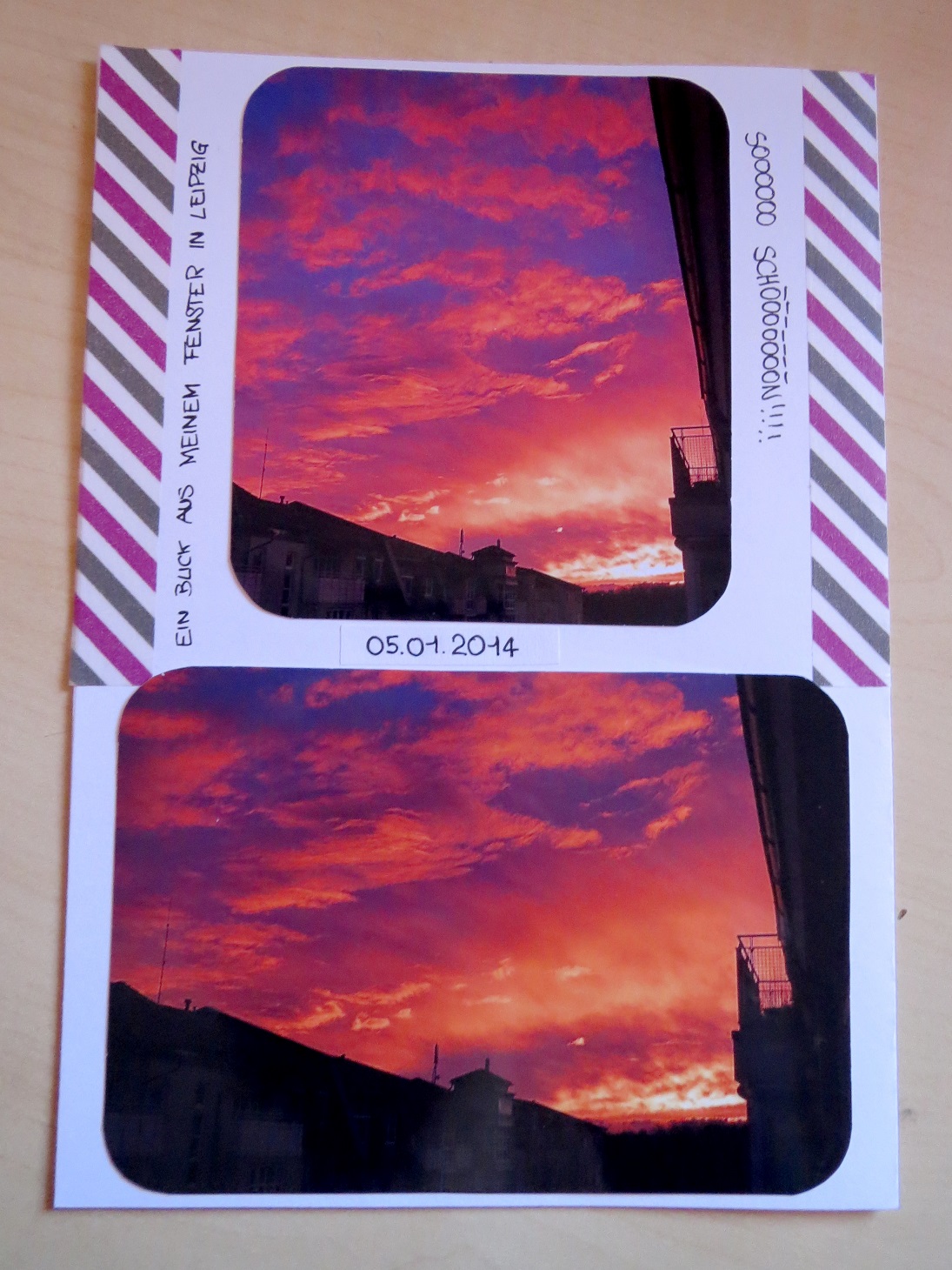Um diesen Plan zu verwirklichen, muss ich jetzt die Monate Januar und Februar kleben, damit ich im April dann mit März weitermachen kann. Links und unten seht ihr ein paar Januar-Bilder. Die ausgedruckten Himmelfotos, die ihr links seht, sind übrigens unbearbeitet. Ich finde die Farben unglaublich schön und finde es faszinierend, welche Farbtöne die Natur hervorbringen kann. Habt ihr auch so tolle Himmelsfotos? Unten sind drei Fotos vom zweiten Januar-Wochenende zu sehen. Meine Eltern hatten beide Geburtstag und haben Sonntags einen großen Familien-Geburtstagsbrunch veranstaltet. Links unten: Für meinen Vater gab es eine Kochschürze. Außerdem habe ich das erste Mal die Fernbusse ausprobiert, da ich nicht Autofahren wollte. Samstags habe ich dann mit meinem Freund ein neues altes Spiel ausprobiert. Neu, weil wir es das erste Mal gespielt haben. Alt, weil ich das Spiel bereits 1999 geschenkt bekommen hatte. Damals fanden wir die Regeln aber sehr kompliziert und danach landete das Spiel im Regal. Im Januar hat es dann dort mein Freund entdeckt.