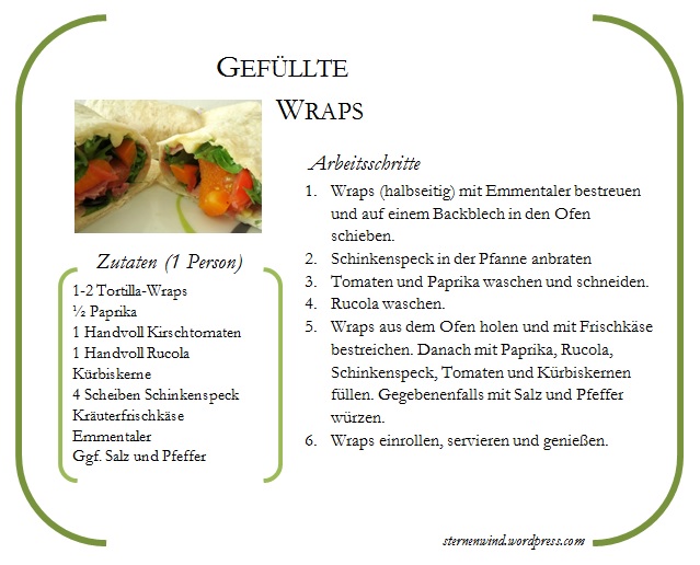 Auf der Suche nach einfachen, abwechslungsreichen und leckeren Gerichten bin ich neulich bei „Alles und Anderes“ auf Wraps gestoßen und fragte mich, warum ich nicht schon früher auf die Idee gekommen bin. Ich liebe Wraps, Enchiladas und Co., esse sie gerne mal, wenn wir abends weggehen. Aber auf den Gedanken, sie mir zuhause selbst zuzubereiten, bin ich bisher noch nie gekommen. Dabei ist das doch gar nicht so schwer. Und das hat sich jetzt endlich geändert. Nachdem ich vorletztes Wochenende mit meinem Freund Enchiladas – ähnlich wie die im Knusperstübchen, nur wesentlich weniger Zutaten – gemacht habe, hatte ich noch zwei Wraps übrig, die ich dann diese Woche mittags schnell verarbeitet habe.