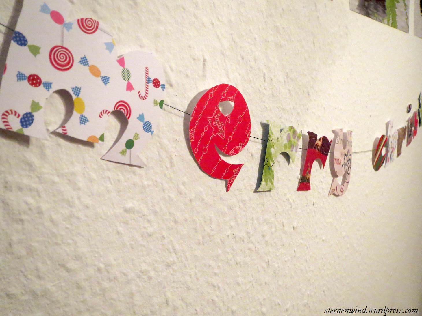 Wenn ihr den Schriftzug an den beiden Fädenenden in die Hand nehmt und umdreht, sollte „merry christmas“ zu lesen sein (wenn nicht, solltet ihr irgendwo nochmal gucken, wo ihr einen Buchstaben falsch aufgeklebt habt ;) ). Jetzt noch zwei Nägel oder Reiszwecken in die Wand, die Schlaufen dort einhängen und schon hängt eure kleine weihnachtliche Girlande.