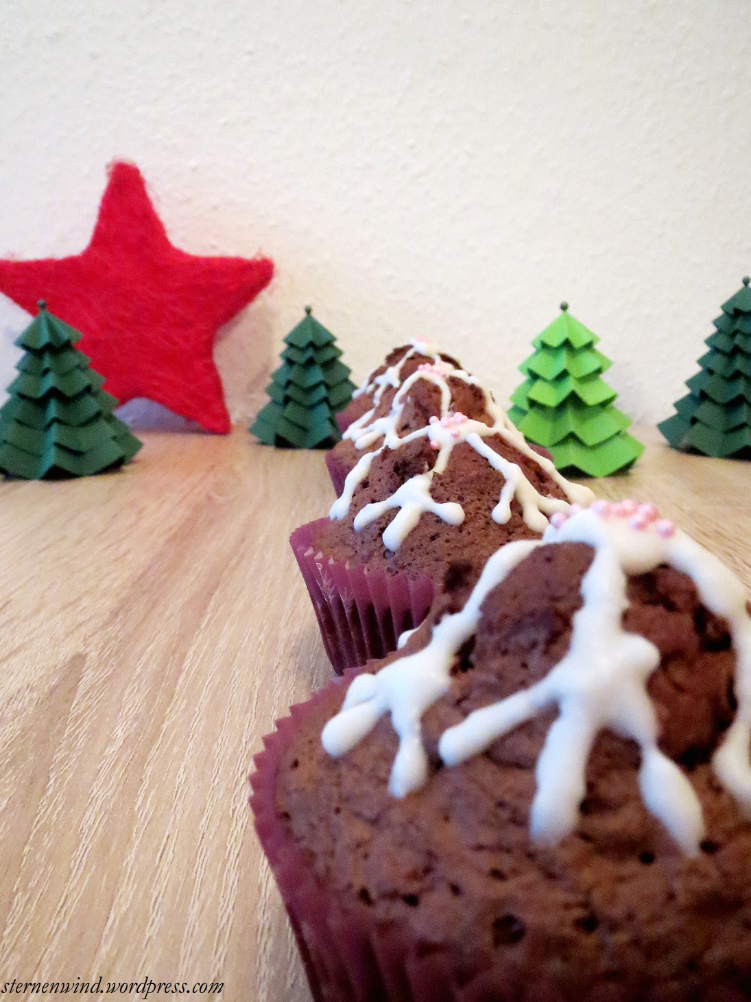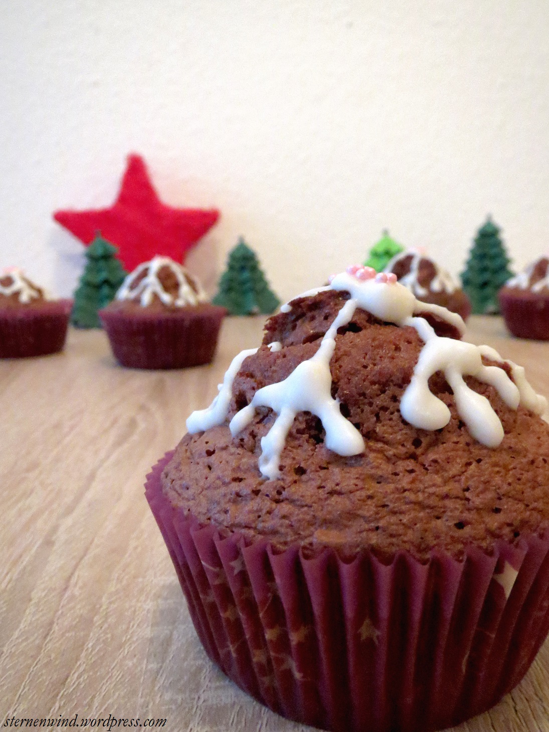 Bei einer Weihnachtsfeier müssen es natürlich weihnachtliche Muffins sein. Außerdem sollte es relativ unaufwendig sein, da ich die Muffins schnell gestern Abend backen musste. Die restliche Zeit war schon für Hochschule, Koffer packen, Geschenke basteln und Co. verplant. (Ich muss auch gleich noch schnell ein Schrottwichtelgeschenk finden und einpacken, das sich heute Abend verschenken lässt).