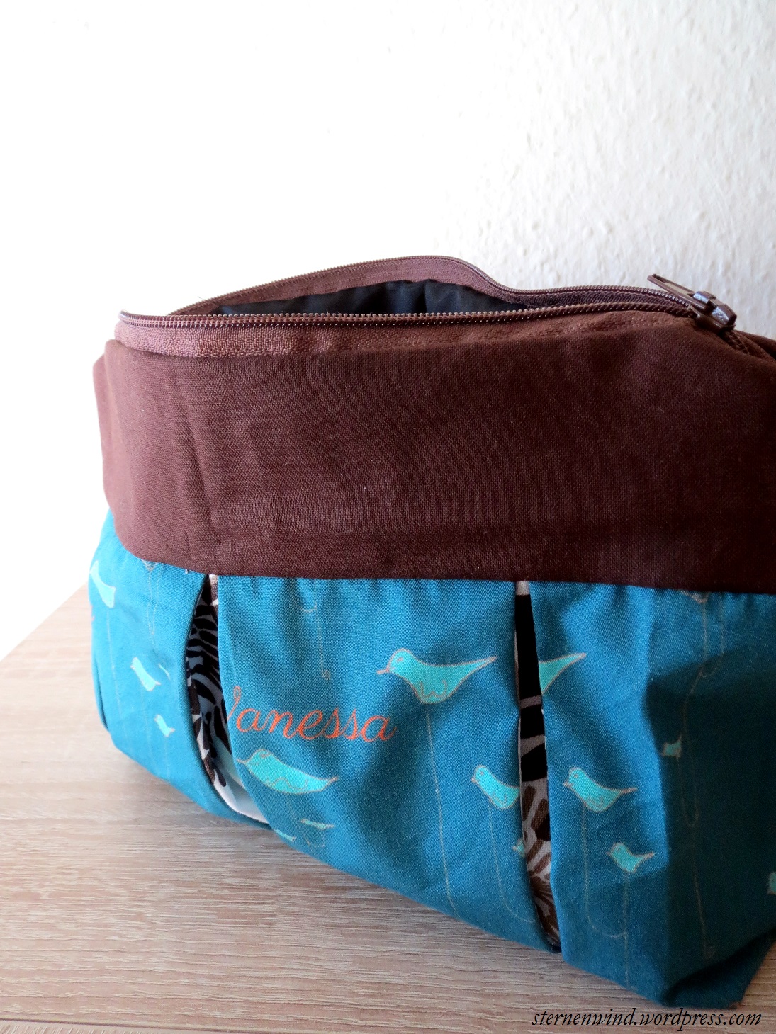 Normalerweise bin ich ja nicht unbedingt ein Anleitungsvideogucker, aber hier ließ sich das nicht vermeiden. Denn ich habe noch nie Kellerfalten genäht. Aber im Grunde geht das ja recht einfach, wie ich feststellen durfte. Den diwidu-Piepmatze-Stoff habe ich dafür als Außenstoff verwendet. Dazu gesellten sich ein weiterer Stoff mit braun-blauen Blumen, ein einfacher braner Stoff, Vlieseline sowie ein dünner, schwarzer Innenstoff.