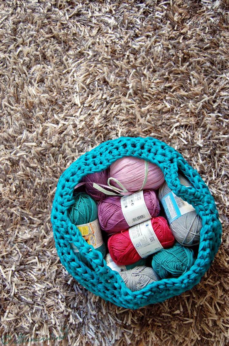 Da ich schon länger damit liebäugelte, die Hooked Zpagetti Wolle auszuprobieren, zog ich also los und kaufte mir eine Rolle in einem wunderschönen Türkiston mit passender Häkelnadel. Und dann entstand der Aufbewahrungskorb für meine Wolle recht schnell. Dadurch, dass die Wolle so dick ist und man mit einer relativ großen Nadel arbeitet, wird der Korb recht schnell groß. Ich hatte den Korb – mit ein paar Unterbrechungen – in ein paar Stunden gehäkelt. Nur die Arme taten mir zum Schluss etwas weh beim Halten der ganzen Masse. Deswegen lag der Korb irgendwann auf dem Schreibtisch, statt nur auf dem Schoß, damit ich ihn nicht die ganze Zeit hochhalten musste.