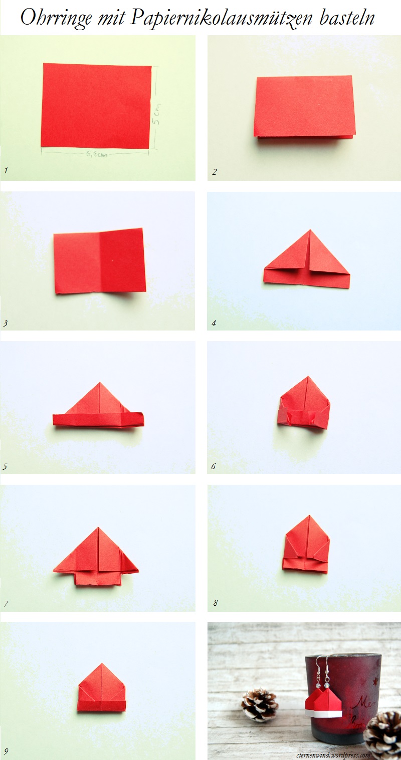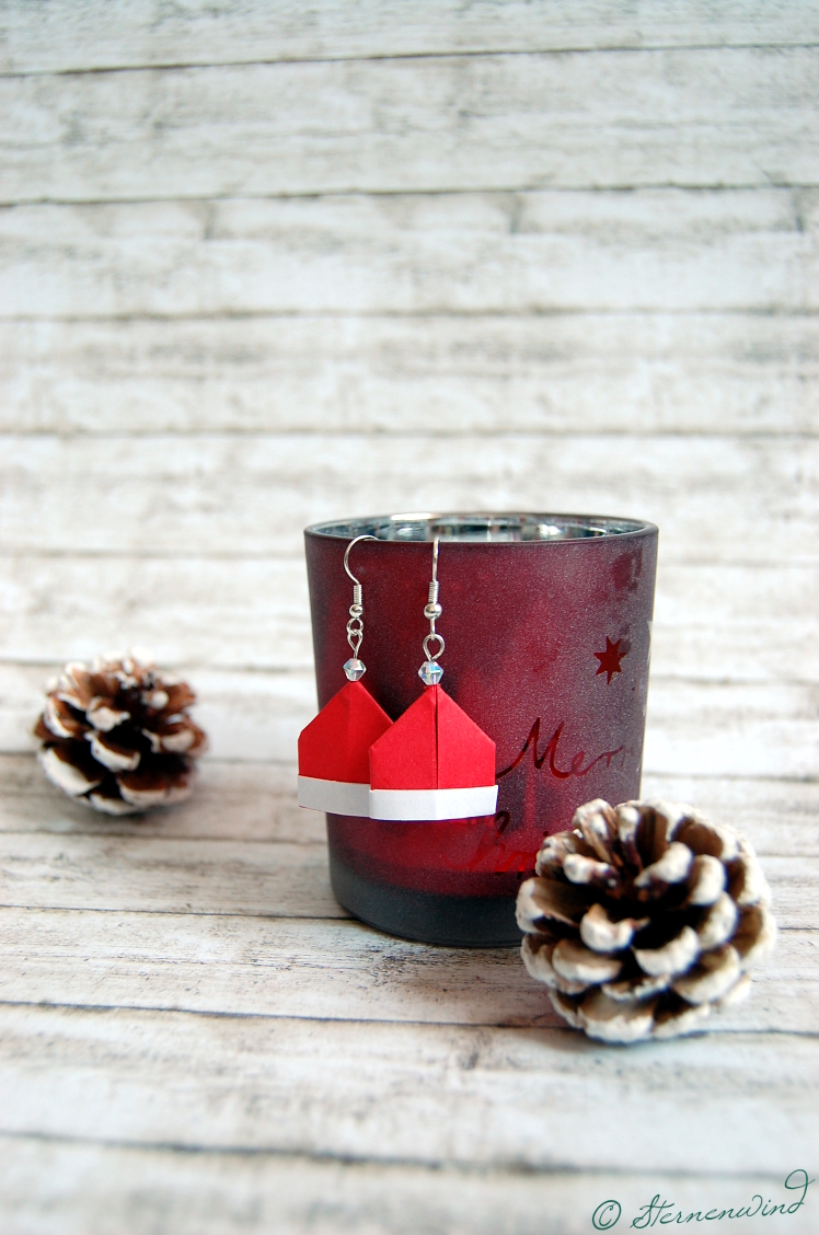 Ich war auf der Suche nach weihnachtlichen Ohrringideen – wie beispielsweise die Schneemannohrringe vom letzten Jahr. Und irgendwo bin ich glaube ich mal über Ohrringe mit Papierschiffchen gestolpert (wenn ich nur wüsste, wo – ich habe keine Ahnung mehr). Und die brachten mich auf die Idee, dass man doch auch Papierhüte falten kann, die sich sicherlich für Nikolausohrringe verwenden lassen.