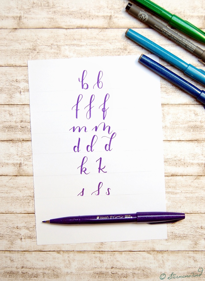 Wenn ihr von eurer Anfangsschrift ausgeht, könnt ihr diese zunächst nach und nach variieren. Neben tanzenden Buchstaben und der Veränderung der Laufweite könnt ihr beispielsweise Schnörkel hinzufügen oder mal eine andere Version des Buchstaben ausprobieren. Zum Beispiel beim kleinen f kenne ich mittlerweile drei verschiedene Versionen, wie ihr dieses schreiben könnt. Beim kleinen b kann der Bogen von oben nach unten oder von unten nach oben gemalt werden. Beim kleinen m könnt ihr die zwei Bögen unterschiedlich groß gestalten. Und schon wirkt der Buchstabe anders.