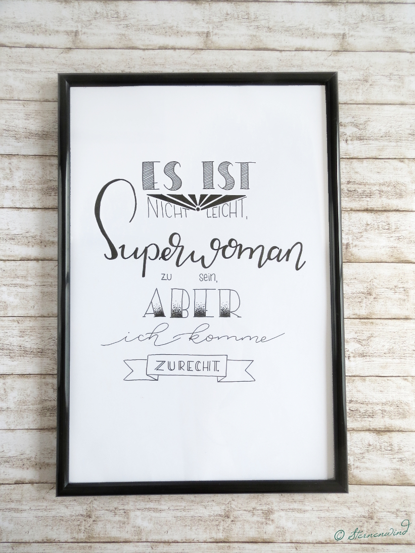 Anfang Mai kramte ich die Idee dann wieder hervor und dabei entstand dieses Lettering, das ich euch heute zeige. Ich wusste eine lange Zeit nicht, was ich lettern soll. Einfach nur ein Wort? Aber welches? Ein „hochtrabendes“ Zitat? Aber vielleicht steht sie da gar nicht drauf. Und im Büro kann ja auch nicht unbedingt alles hängen. Doch dann fiel mir die „lustiges Lettering“-Challenge von gelbkariert ein und ich stöberte in gelbkarierts Instagram-Account, bis ich schließlich fündig wurde: