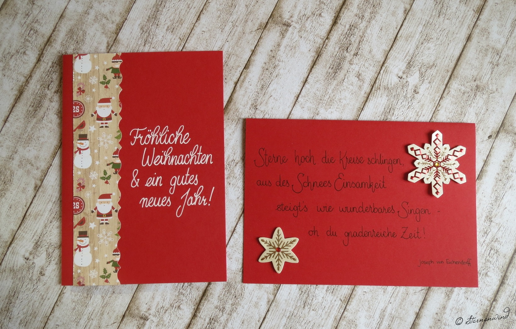 Seit ein paar Jahren bastle ich fleißig Weihnachtskarten für die Adventszeit. Um die 20 Stück sind es jedes Mal. Dieses Jahr habe ich Karten in vier Farbrichtungen gestaltet: Grün, Rot, Beige/Braun und Mint. Und ich habe dieses Jahr viele längere Zitate und Gedichte gelettert, nicht nur die üblichen „Fröhliche Weihnachten“-Wünsche. Als kleine Inspirationsquelle zeige ich dir heute die grünen und roten Karten.