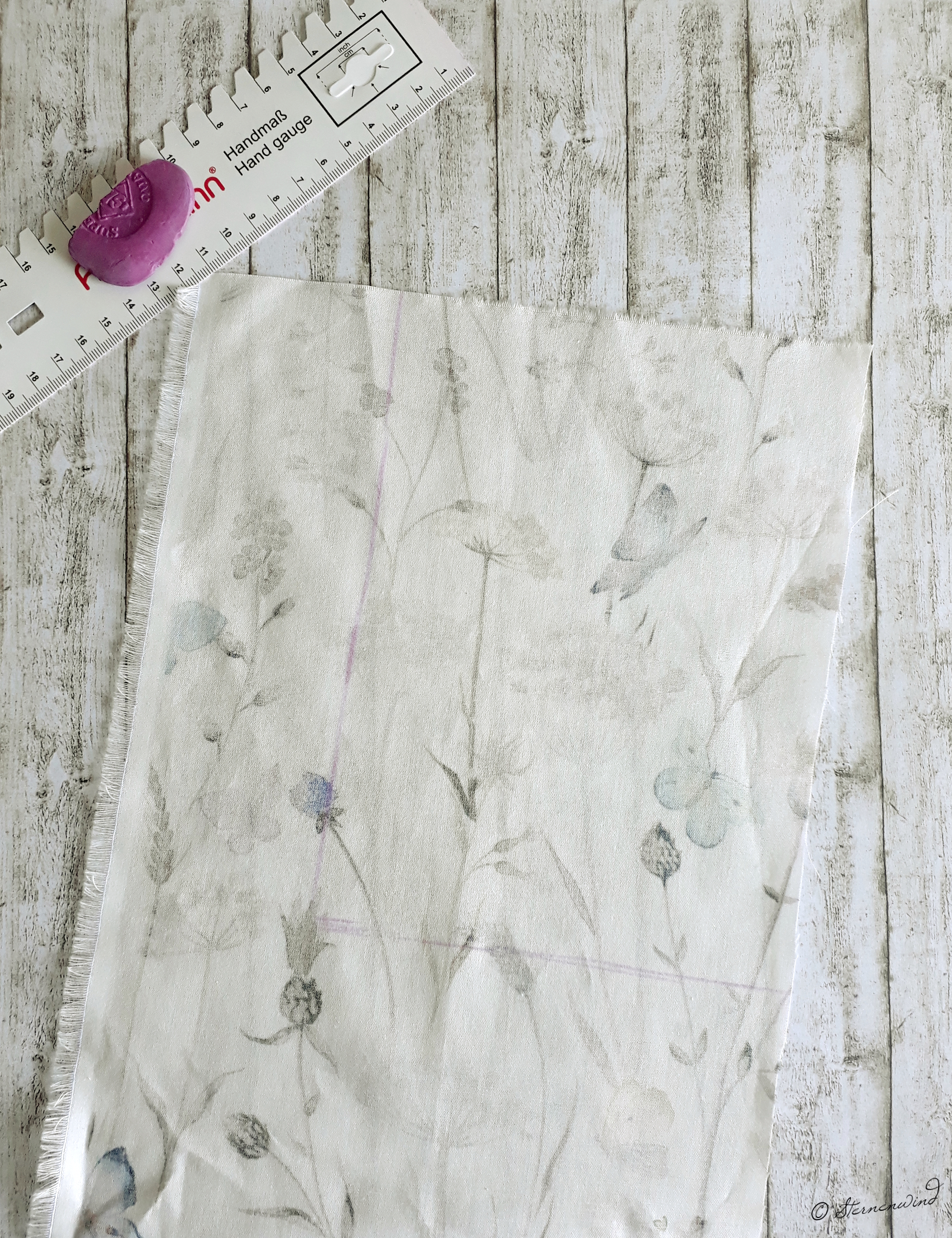 Bügle den Stoff glatt. Zeichne auf die Stoffreste ein 15,5 cm (Breite) x 22 cm (Länge) großes Rechteck auf und schneide dieses aus (Bild Schritt 1). Klappe an den 15,5 cm langen Seiten beide Seiten jeweils 2x um 1 cm nach innen um, so dass du hübsche Seite siehst, und stecke es fest (Bild Schritt 2). Nähe diesen doppelten Umschlag jeweils füßchenbreit zusammen und verriegle am Anfang und Ende jeweils die Naht. Ich habe dafür bei meinem einfarbigen Stoff einen Zickzackstich verwendet, da dieser schön dekorativ ist. Du kannst aber auch einen einfachen Geradstich verwenden, z. B. bei gemusterten Stoffen.