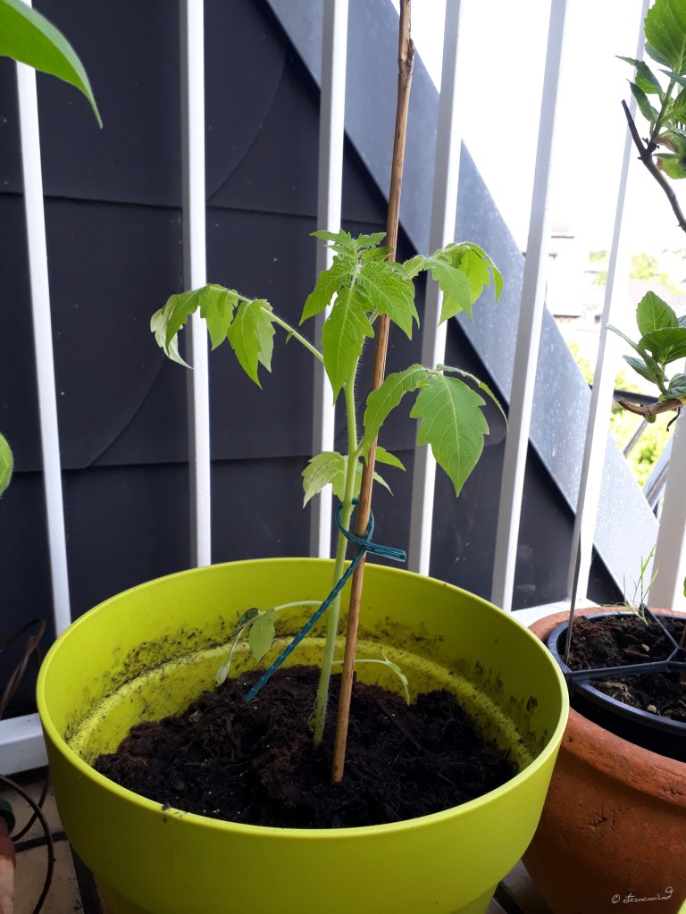 Meine Gurken brauchen langsam größere Rankhilfen und zeigen die ersten Blütenansätze und einige Tomaten sind so in die Höhe und Breite gewachsen, dass sie einen größeren Topf brauchen. Jetzt wird es also Zeit, dass sie nach draußen ziehen und ggf. vorher nochmal umgetopft werden.